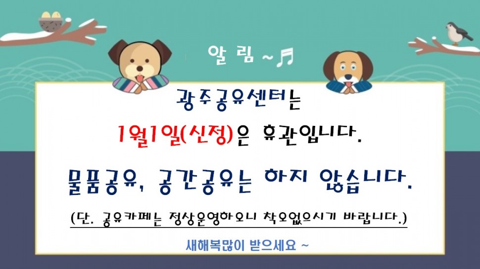 | 1773 | 광주공유센터 1월1일 이용 안내 | 공유광주 | 482 | 2018-12-26 |