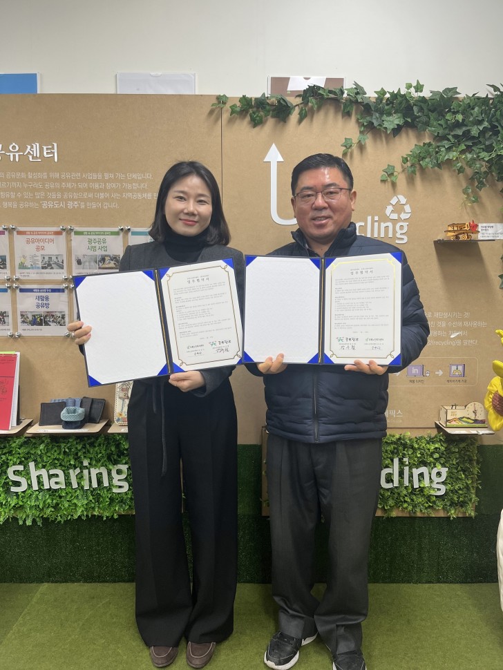 26.01.28 광주공유센터는 초록노인복지센터와 지역사회 복지 증진 및 자원순환 활성화를 위한 업무협을 체결하였습니다. 양 기관은 이번 협약을 바탕으로 어르신 복지 지원, 공유자원 연계, 협력 프로그램 운영 등 다양한 분야에서 상호 협력해 나갈 계획입니다.