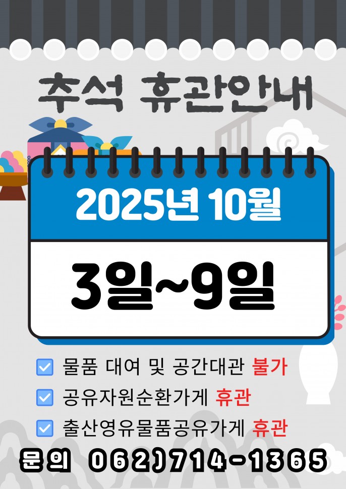 | 296 | [공지] 광주공유센터 휴관 안내 [10.3 ~… | 공유광주 | 286 | 2025-10-02 |