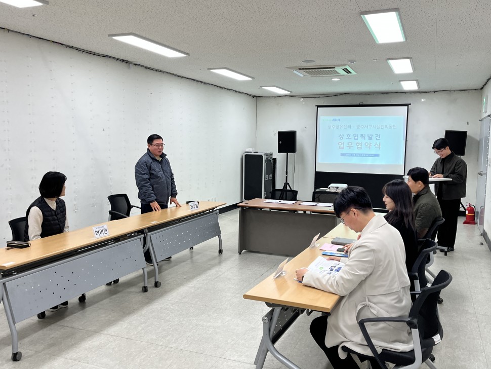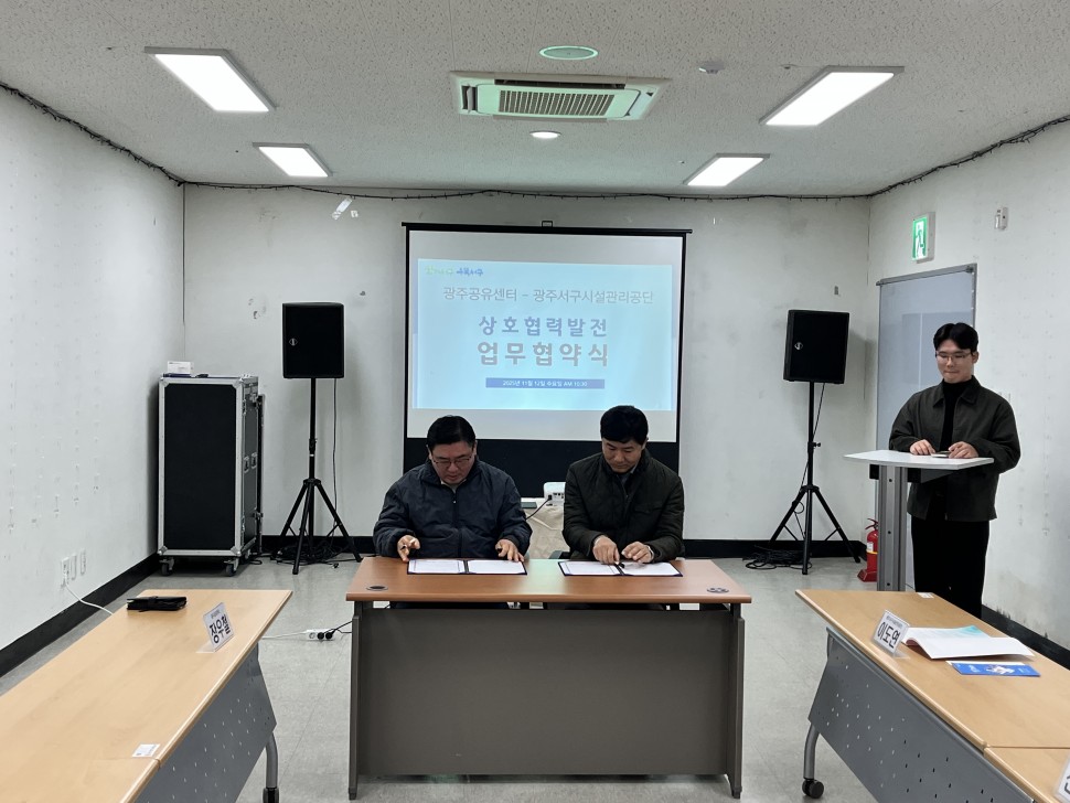 2025. 11 12 광주공유센터와 광주광역시 서구시설관리공단이 상호 협력과 공유문화 확산을 위해 업무협약을 체결했습니다. 이번 협약을 통하여 양 기관은 지역사회 공유사업 활성화와 자원순환 활용 등 다양한 사업들에 관하여 공유할 예정입니다. 앞으로도 광주 지역에서 공유문화가 더욱 확산될 수 있도록 최선을 다하겠습니다.