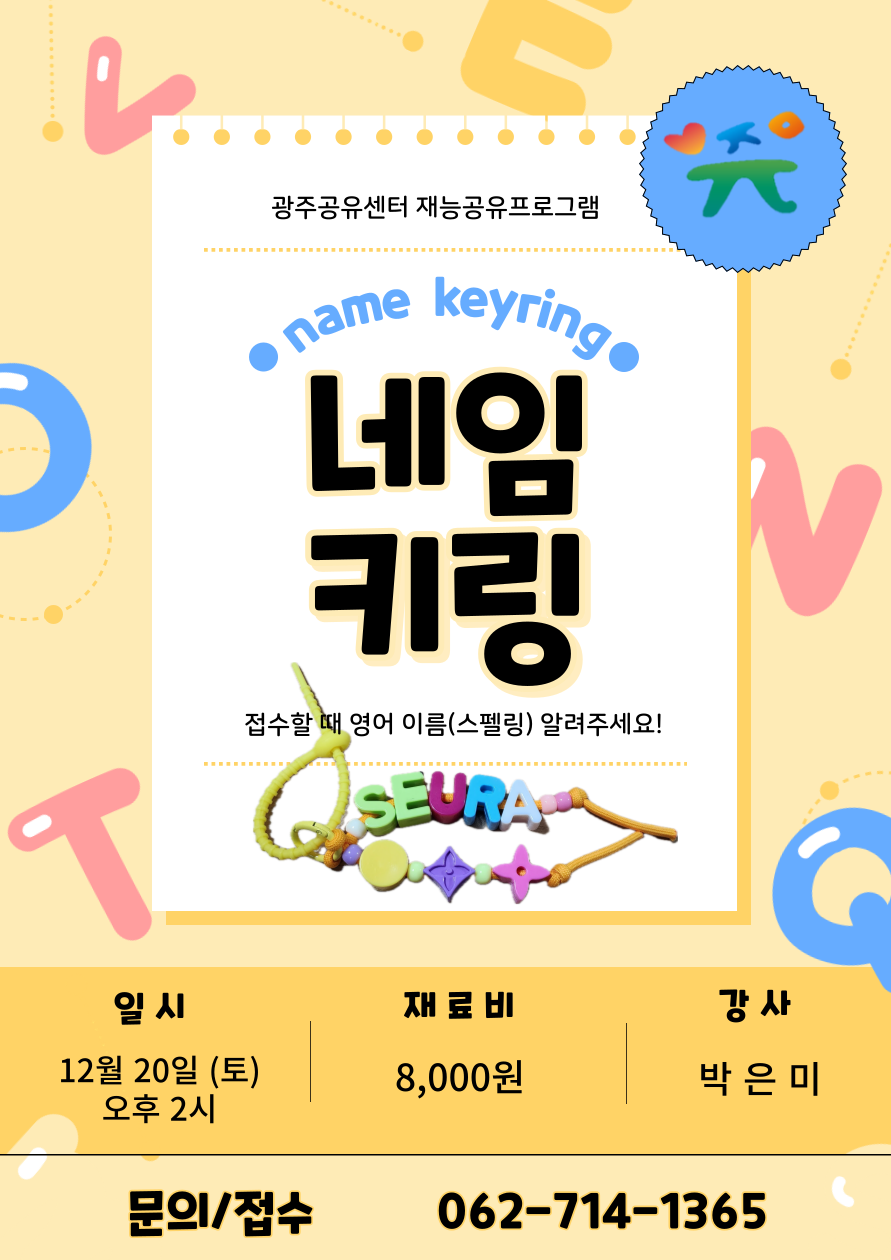 | 공지 | [재능공유] 네임키링 만들기 | 공유광주 | 28 | 2025-12-11 |